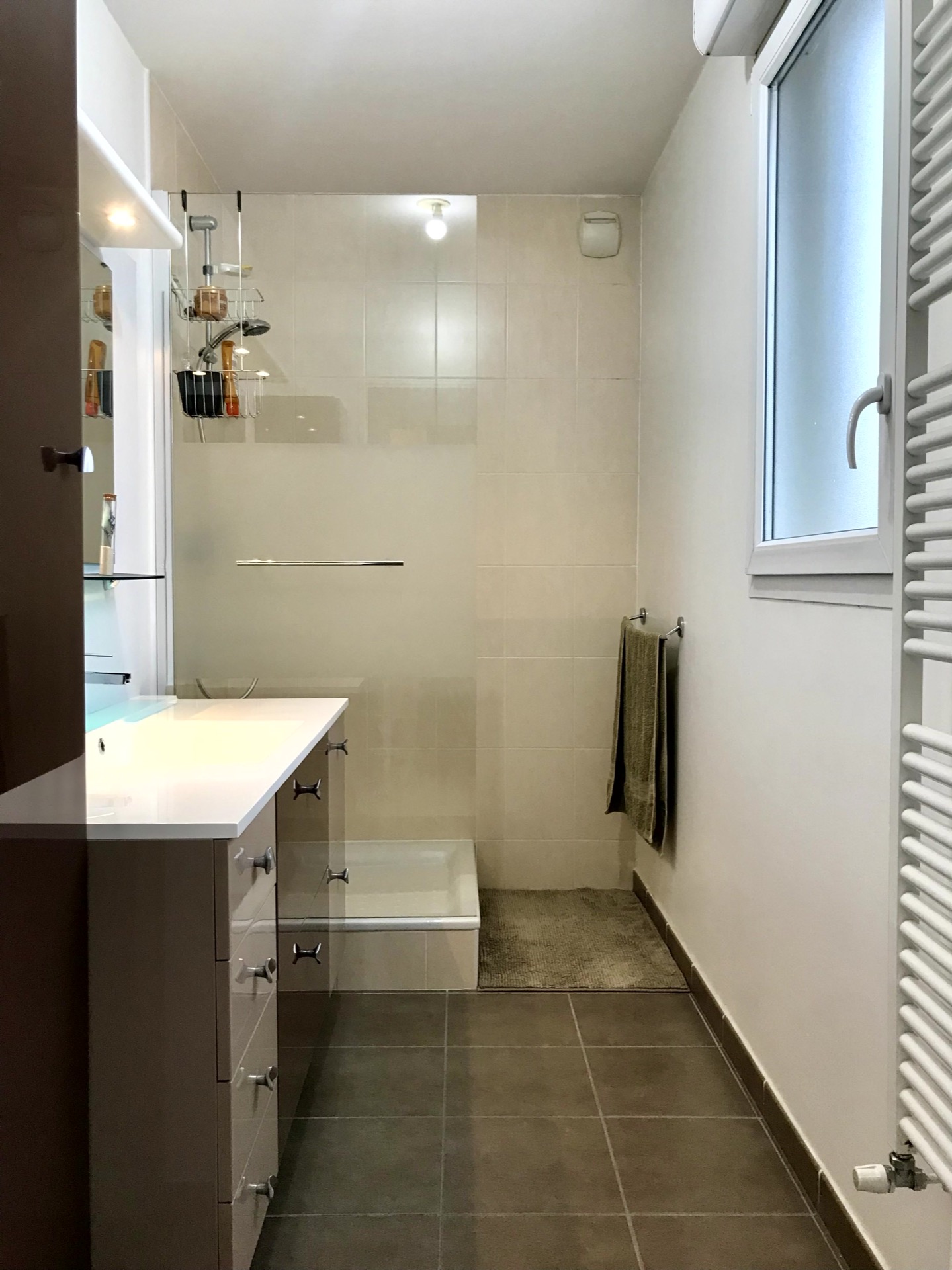 À l'étage, la salle d'eau est équipée d'une fenêtre oscillo-battante orientée OUEST, un bac de douche 90 cm x 90 cm, un radiateur sèche-serviettes et des meubles.