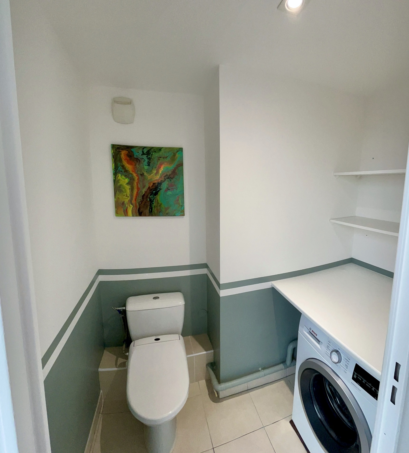Il donne sur deux terrasses, deux chambres, une salle d'eau et une buanderie équipée d'un WC et où un