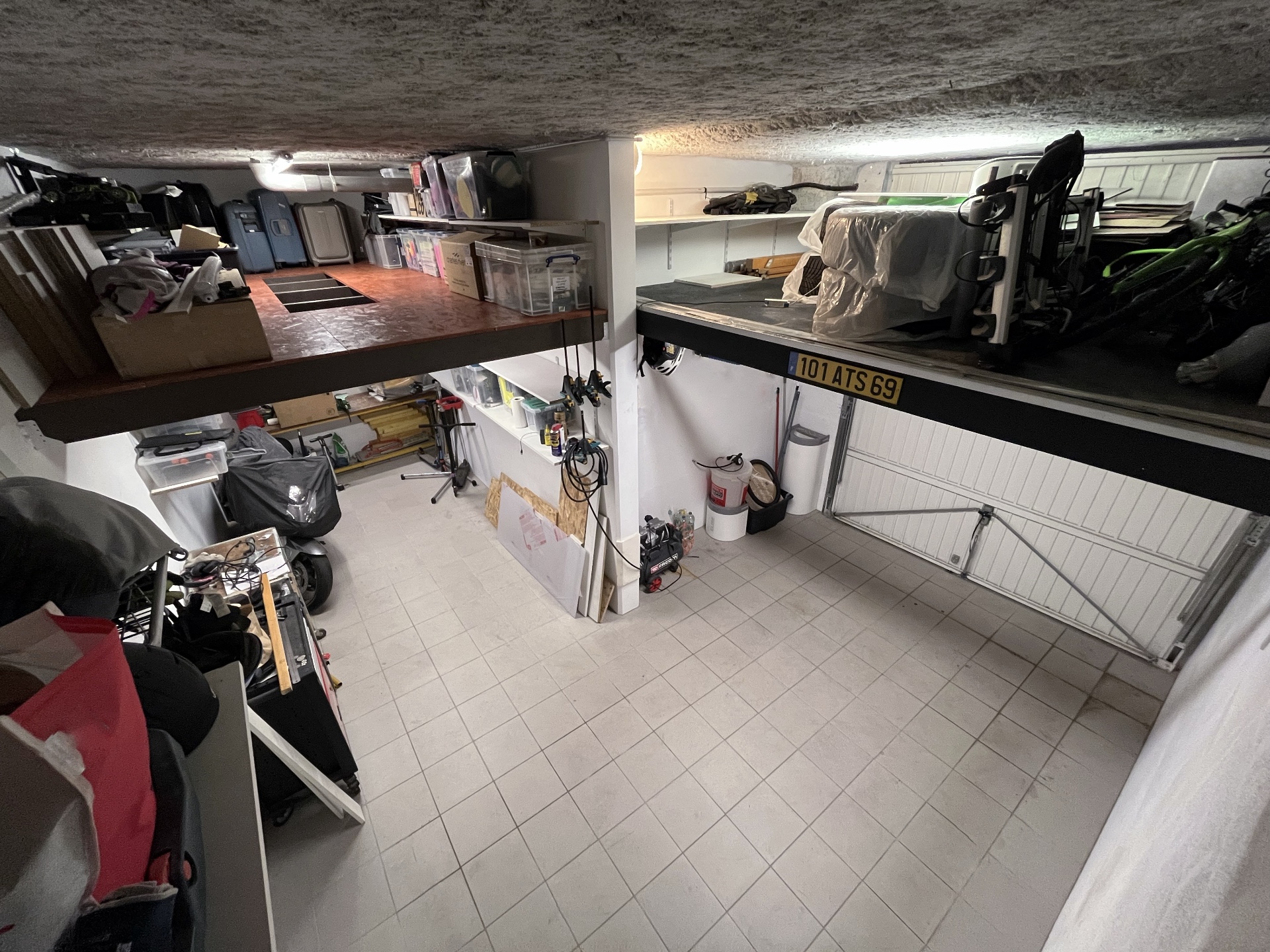 1 exceptionnel garage peint, carrelé, électrifié (section 10mm², calibre 32A avec prise P17 7kW) avec mezzanines (environ 7m² + 9m²) + plusieurs m² d'étagères